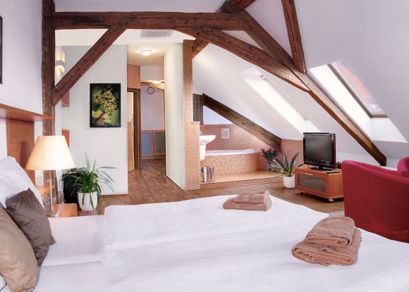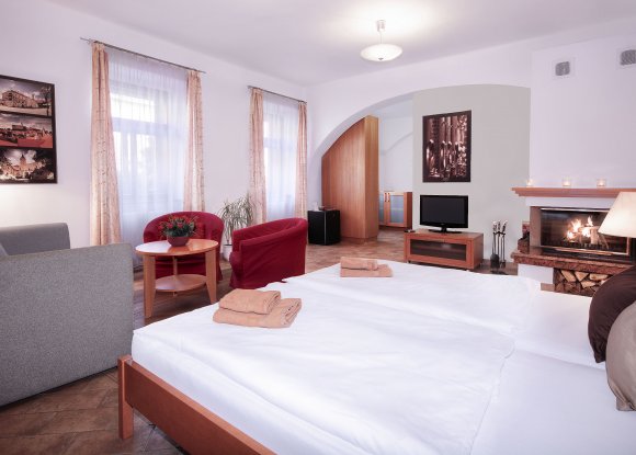 LCD TV, satellite, air conditioning, internet, minibar, safe, hot drink set (kettle, coffee, tea, sugar, cream), fire place, WC, bathroom with shower, hair dryer, umbrella, 2 chairs, sofa bed, lamp + table lamps