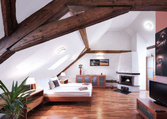 LCD TV, satellite, internet, air conditioning, minibar, fire place, hot drink set (kettle, coffee, tea, sugar, cream), safe, WC, atypical bathroom with bath looking over the whole apartment, hair dryer, umbrella, 2 chairs, sofa bed, lamp + table lamps